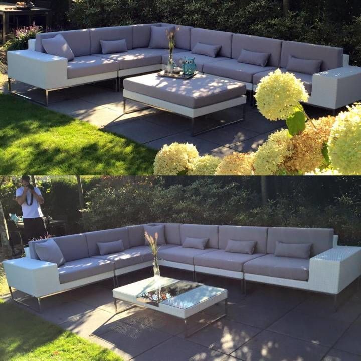 Mega hoekbank Lineo wit, ook in zwart of rondwicker grijs te verkrijgen. De perfecte design loungeset voor een groot terras, veel zitplaatsen en een heerlijk lig, lounge plek.