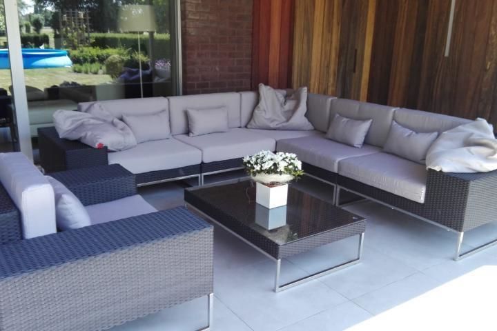 Loungeset Lineo zwart, hier als een XXL mega grote lounge hoekbank opstelling. Optimaal relaxen en loungen met veel zitplaatsen op dit mooie zonnige terras.