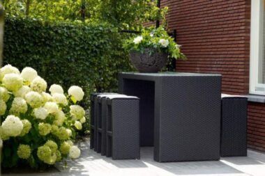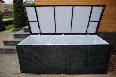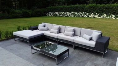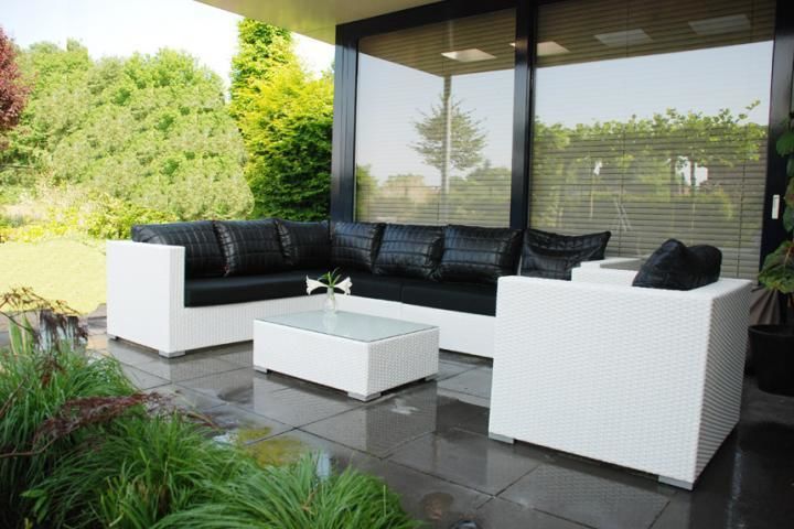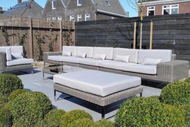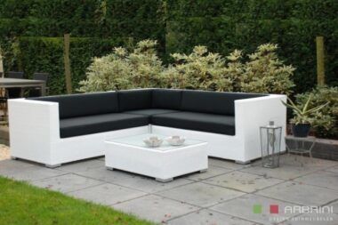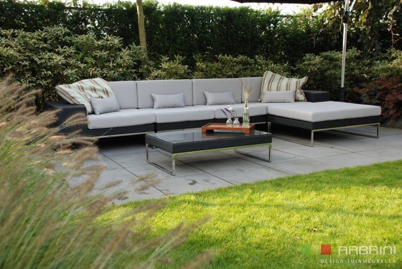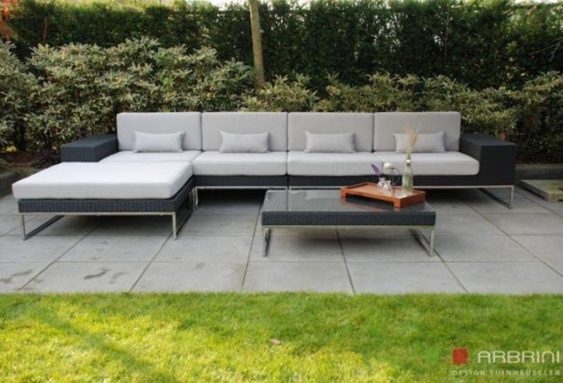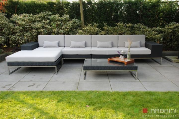 Design Loungeset Lineo zwart is een eigen ontwerp van Arbrini. Deze kunststof wicker lounge bank van Arbrini is maar liefst 3.80m. lang. Door het strakke uiterlijk van deze zwart wicker lounge tuinbank Lineo met rvs onderstel, past deze perfect in de tuin maar staat deze ook prachtig in een veranda, serre of tuinkamer. De loungeset Lineo is standaard 3.80 lang en is voorzien van een handige voetenbank/ hocker. De hocker / voetenbank kan zowel links als rechts aan de lounge-bank geplaatst worden. Deze Lineo bank is ook in de kleur wit, grijs of rondwicker grijs te verkrijgen.