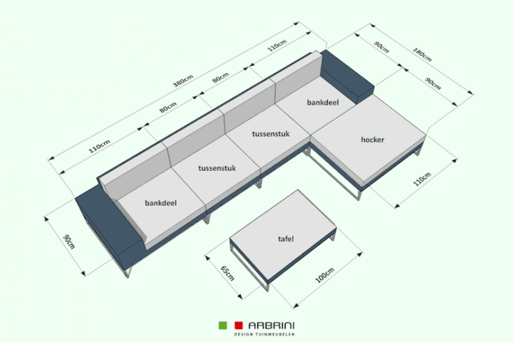 • 2 x eindstuk van 1.10 x 90cm met een armleuning (30cm breed)