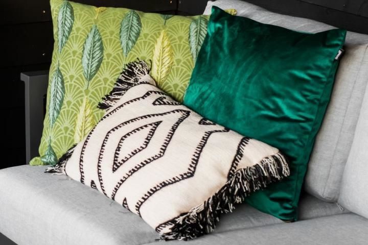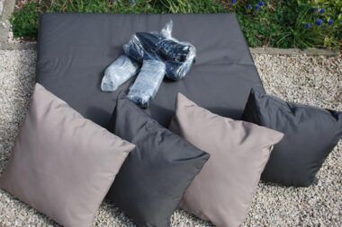 • 9-delige kussenset 12cm dik met lichtgrijze hoezen/slopen om de kussens.
